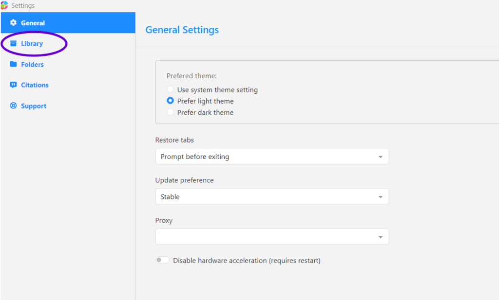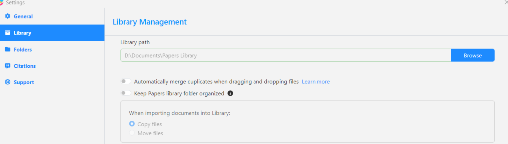 From the Library tab you will be able to select the location where you can save your PDFs. As well as merge duplicates when dragging and dropping them into your library. The application will check if there are duplicate DOIs with those already in your library and merge them.